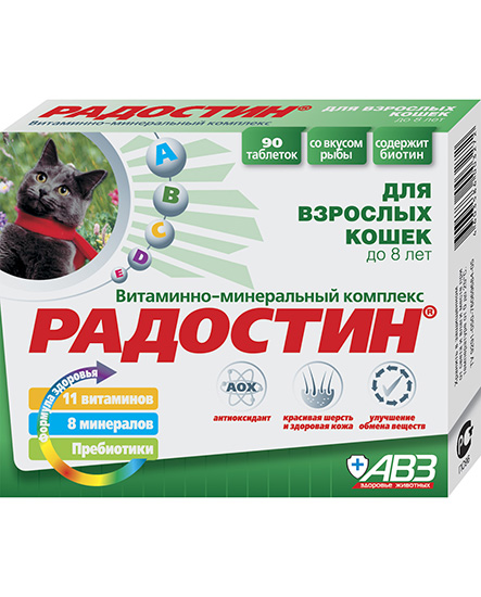 Радостин — сбалансированный витаминно-минеральный комплекс с максимальной эффективностью для организма животного. Витамины назначаются при проблемах с обменам веществ, недостатке витаминов, макро- и микроэлементов, при риске развития заболеваний от их недостатка. Входящие в состав компоненты восстанавливают и поддерживают репродуктивную функцию, а также, положительно влияют на состояние кожи и шерсти у котов.